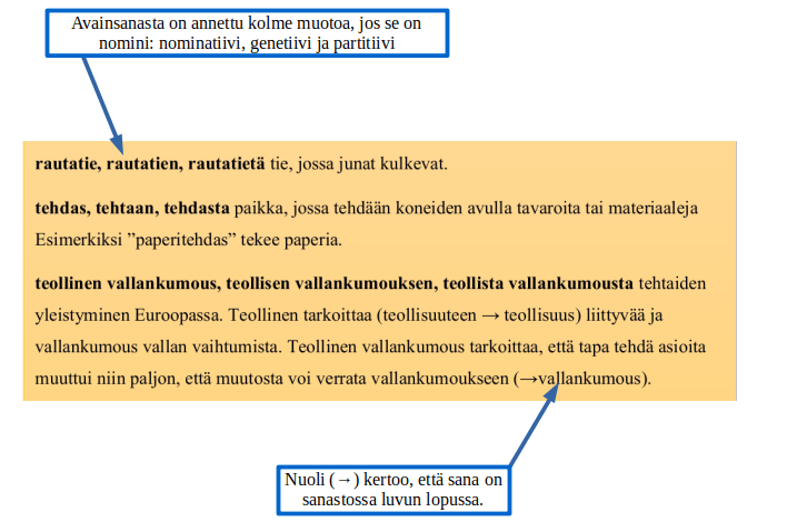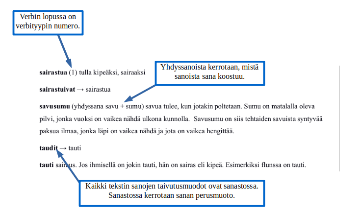 Jokaisella alaluvulla on oma sanasto. Sanaston voi ladata sivulta omana tiedostonaan. Kaikki kappaleen alleviivatut sanat ovat sanastossa. Sanastossa on selitetty sanat tekstin ja mahdollisesti kuvien avulla. Jos sana on tekstissä taivutettuna, sanastosta näet sanan perusmuodon. Sana on aina selitetty perusmuodon kohdalla. Jos sana on verbi, suluissa on kerrottu verbityypin numero. Jos sana on yhdyssana, se kerrotaan sanan kohdalla ja yhdyssanasta kerrotaan, mistä sanoista yhdyssana on muodostunut.
